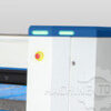 Standard safety features: 3-switch foot pedal with panic button, front light barriers, LED status lights (Red: emergency/error, Blue: manual/setup)